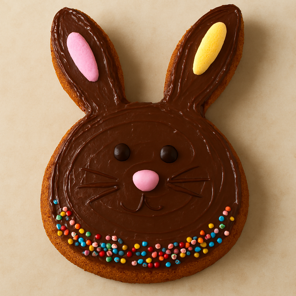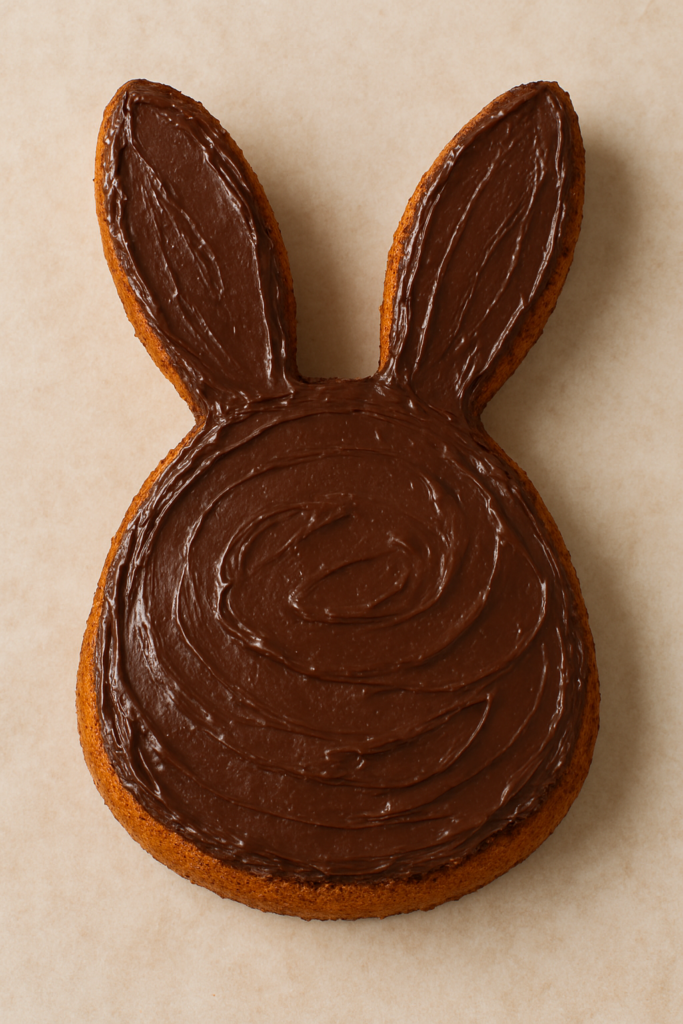 Montagem em formato de coelho: Após esfriar, corte o bolo em formato de coelho (use molde de papel ou faça duas orelhas com pedaços da massa). Cubra com o brigadeiro ainda morno.