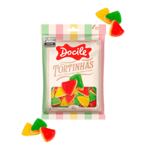 A Docile lançou recentemente a bala de gelatina tortinhas! transformando sobremesas clássicas em balas de gelatina. A embalagem de 80g traz pequenas fatias coloridas que