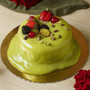 Receita de Bolo de Pistache com Frutas Vermelhas uma combinação elegante e irresistível que une o sabor amanteigado do pistache com a acidez vibrante das