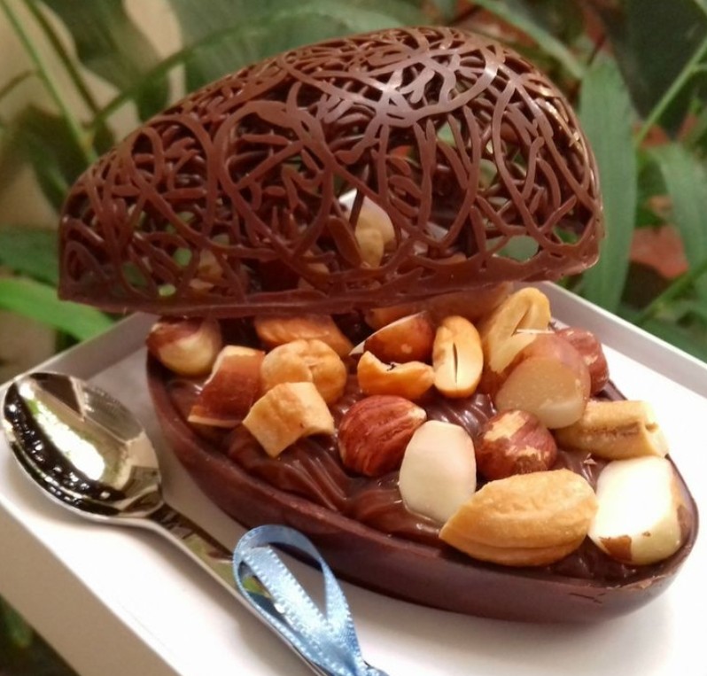 Derreta o chocolate com o óleo de coco em banho-maria ou no micro-ondas (mexendo a cada 30 segundos). Com uma colher, espalhe uma camada fina de chocolate em uma forma de ovo de Páscoa. Leve à geladeira por 10 minutos. Repita o processo para formar 2 a 3 camadas, garantindo que a casca fique firme. Se quiser rechear, adicione o creme de castanhas ou coco antes da última camada de chocolate. Desenforme com cuidado e mantenha refrigerado até servir.